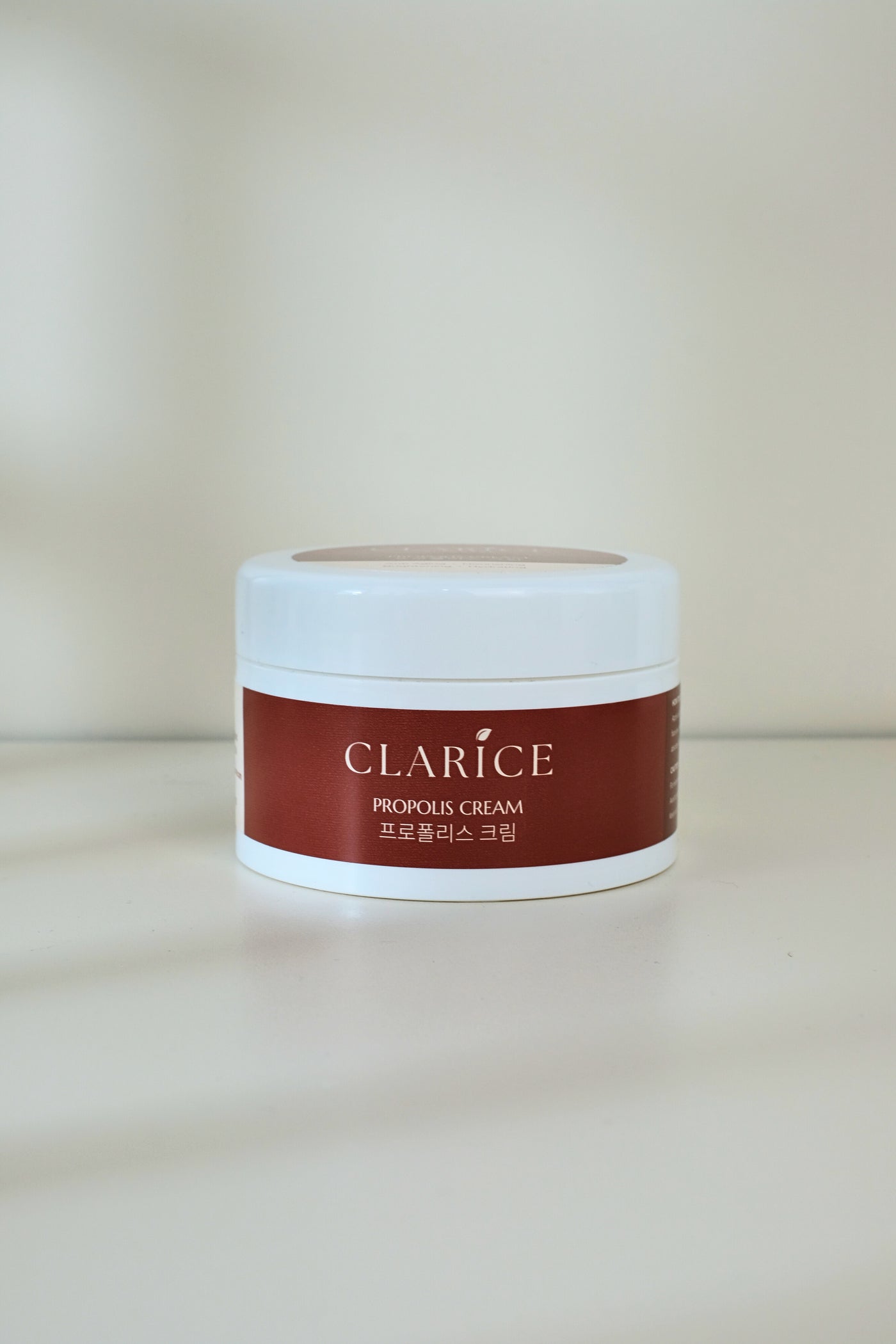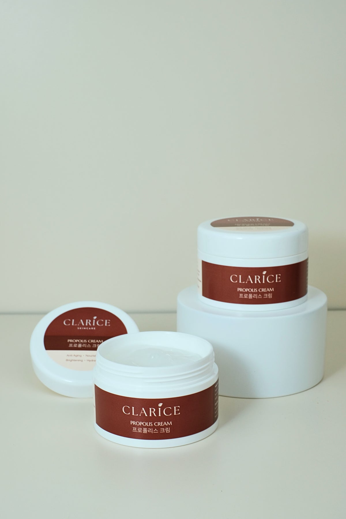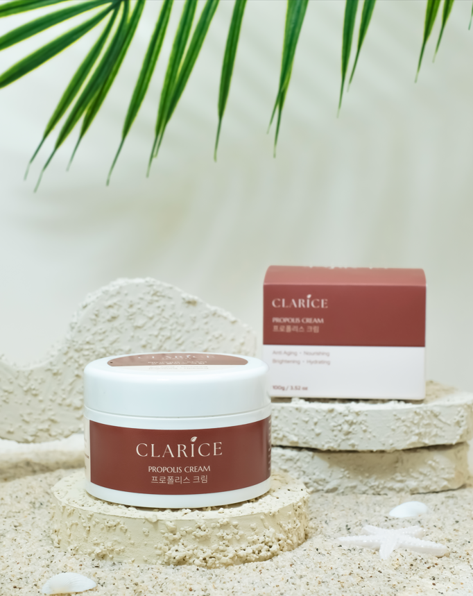 Clarice Propolis Cream is your go to daily moisturizer crafted for sensitive, dry, and early aging skin. Enriched with nature’s powerful healing ingredients like Propolis Extract, Centella Asiatica, and Niacinamide. This lightweight cream doesn’t just soothe, it repairs your skin barrier while restoring its healthy glow.